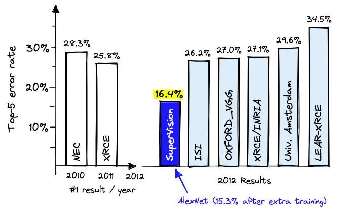 그 최초의 사례가 바로 2012년 ILSVRC 대회에서 압도적인 점수를 기록하며 우승한 AlexNet이다. 기존의 모델들보다 훨씬 깊은 신경망과 GPU를 활용한 대규모 병렬 연산을 통해 현대 딥러닝 시대의 개막을 알렸다.